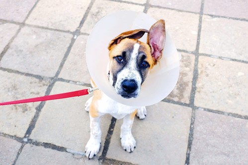 A dog with a hot spot may be fitted with a collar to prevent it from reaching the irritated area of skin, or it may be fitted with a sock if the hot spot is on one of its paws.